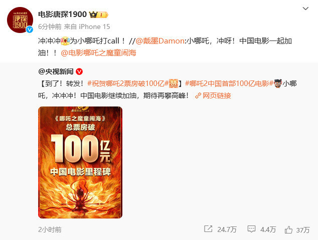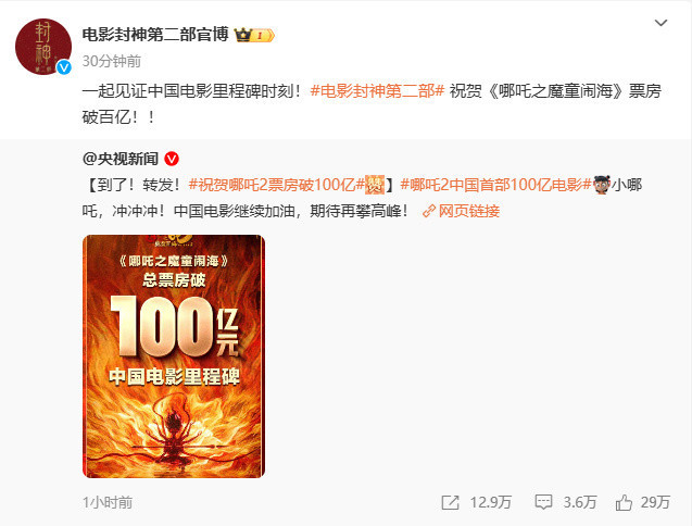 《封神第二部:战火西岐》:“一起见证中国电影里程碑时刻!电影《封神第二部》祝贺《哪吒之魔童闹海》票房破百亿!!”