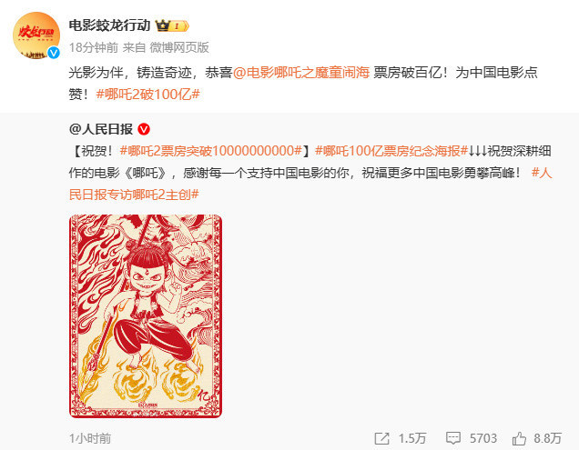 《蛟龙行动》:“光影为伴,铸造奇迹,恭喜电影《哪吒之魔童闹海》票房破百亿!为中国电影点赞!”