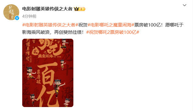 《射雕英雄传:侠之大者》:“祝贺电影《哪吒之魔童闹海》票房破100亿!愿哪吒于影海乘风破浪,再创斐然佳绩!”
